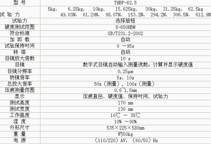 產(chǎn)品概述: THBP-62.5數(shù)顯小負荷布氏硬度計是光機電一體化的高新技術產(chǎn)品,布氏硬度值,它造型新穎、美觀,河南硬度計,具有良好的直觀性、可操作性和可靠性,江蘇硬度計,是測試小負荷布氏硬度的理想產(chǎn)品。 功能特點: 1 、 儀器具備7級試驗力,青島布氏硬度計培訓,8種測試的布氏標尺任意選擇; 2、具備了5x 和10x 兩組物鏡,布氏硬度儀,且都能參與測量; 3、物鏡和壓頭間智能式自動切換; 4、預置試驗力保持時間、調節(jié)測量光源的強弱功能; 5、自動顯示測量壓痕長度、硬度值、測量次數(shù)等;帶熱敏打印機。 6、硬度測試結果打印輸出,RS232超級終端設置,供用戶擴展功能。 7、硬度計還可根據(jù)用戶特殊需求配置CCD裝置、視屏測量裝置和攝像裝置。 8、本儀器采用精密的結構設計,試驗力施加由力值傳感器控制,手提式布氏硬度計,使整機結構緊湊,加卸試驗力時平穩(wěn)、準確。在電氣上由CPU控制試驗過程,數(shù)顯布氏硬度計,物鏡和壓頭采用智能式自動切換,華銀硬度計,切換定位采用機械與電子雙重配合,布氏硬度計 英語,使定位精度更高。 9、本儀器適用于測量鑄鐵、有色金屬及合金材料,布氏硬度 hb,各種退火、調質處理后的鋼材。特別是較軟的金屬如:鋁、鉛、錫等材料測試的硬度值更正確。 技術參數(shù):