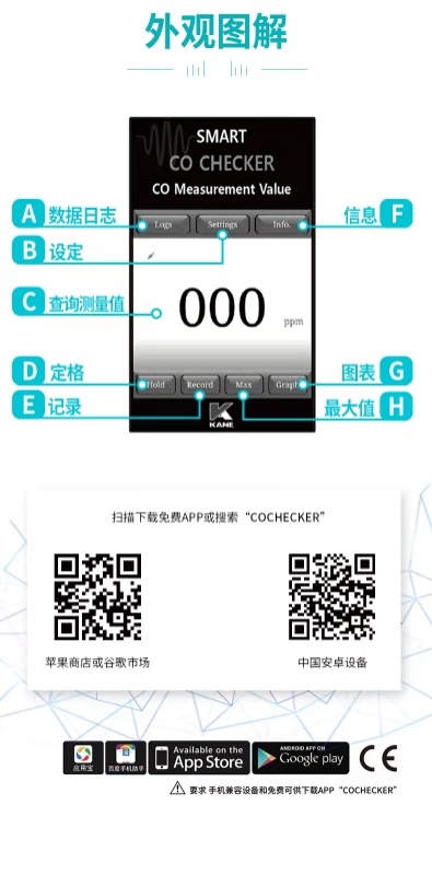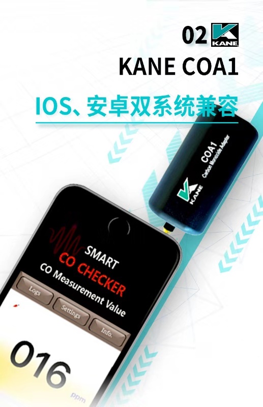 英國(guó)KANE凱恩手機(jī)銜接一氧化碳探測(cè)儀 KANE COA1 一氧化碳探測(cè)儀 手機(jī)銜接解決方案 • 可探測(cè)一氧化碳至1ppm • 一氧化碳讀取至999ppm • 與iOs或安卓系統(tǒng)兼容 • 可在免費(fèi)APP上顯示3個(gè)危險(xiǎn)等級(jí) • APP上可以保存數(shù)據(jù)和發(fā)送郵件數(shù)據(jù) • 工作溫度:32O至104℉(0O至40℃) • 準(zhǔn)確度:±(3%+1PPM
