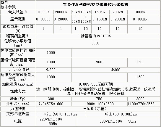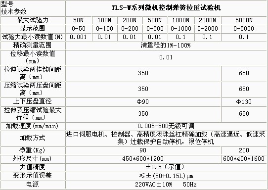 產(chǎn)品概述: TLS-WI系列微機(jī)控制拉壓彈簧試驗(yàn)機(jī)依據(jù)JB/T7796-2005《拉壓彈簧試驗(yàn)機(jī)技術(shù)條件》規(guī)定的技術(shù)要求制成。該型拉壓彈簧試驗(yàn)機(jī)主要用 于測試各種螺旋彈簧及彈性元件的強(qiáng)度,即在一定的變形量(或高度)下測試彈簧的試驗(yàn)力或在一定的試驗(yàn)力下測定彈簧的高度或變形量。 功能特點(diǎn): 本機(jī)主要適用于各種彈簧的強(qiáng)度試驗(yàn)、力學(xué)性能及工序能力分析。 本機(jī)軟件包有速度控制、參數(shù)輸入、數(shù)據(jù)處理、結(jié)果觀察、圖表顯示、圖表打印、數(shù)據(jù)保存等功能模塊組成。 試驗(yàn)方式多樣化,地彈簧試驗(yàn)機(jī),可以設(shè)置彈簧的試驗(yàn)力,檢測彈簧的剩余高度或變形量;也可以設(shè)置彈簧的剩余高度或變形量,檢測試驗(yàn)力等功能。 多點(diǎn)自動變速采集數(shù)據(jù),并自動返回到初始位置,1噸彈簧疲勞試驗(yàn)機(jī),整個試驗(yàn)過程自動化。 過載自動返回,彈簧壓力機(jī),以保護(hù)傳感器不受損壞。 具有強(qiáng)大的數(shù)據(jù)處理及數(shù)據(jù)統(tǒng)計(jì)功能,繪制剛度曲線、計(jì)算彈簧的分段剛度,可以進(jìn)行數(shù)據(jù)統(tǒng)計(jì),繪制正態(tài)分布圖、計(jì)算工序能力指數(shù)。采用數(shù)控電機(jī)調(diào)速系 統(tǒng)或進(jìn)口交流伺服電機(jī)及調(diào)速器和精密滾珠絲杠副組成傳動系統(tǒng),與高精度負(fù)荷傳感器、位移傳感器及數(shù)字式數(shù)據(jù)采集卡、PC組成測控系統(tǒng),實(shí)現(xiàn)了穩(wěn)定可靠運(yùn)行 及精確測量。 技術(shù)參數(shù): ![]() ![]()