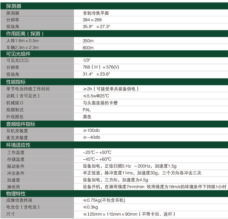 產(chǎn)品特點 多傳感器集成 集可見光、紅外、音頻于一體,夜視紅外熱像儀,能在夜間及惡劣氣象條件下輔助單兵進(jìn)行偵察