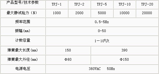 產(chǎn)品概述: TPJ系列機械式彈簧疲勞試驗機主要應用于拉伸、壓縮螺旋彈簧的疲勞壽命試驗 功能特點: 振幅、頻率可調(diào);振動次數(shù)及頻率數(shù)字顯示; 預置試驗次數(shù)自動停機;可做單對或多對彈簧的試驗機; 操作簡單、運行可靠。 技術參數(shù):