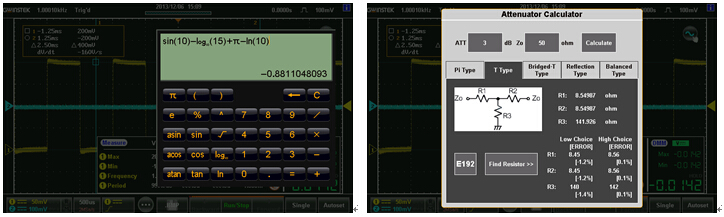 GDS-300/GDS-200系列示波器內(nèi)建多樣化的應(yīng)用軟件以提供使用者極為貼心的輔助工具。在繁瑣的電路設(shè)計當(dāng)中,工程計算機軟件可提供簡易到進階的數(shù)學(xué)計算功能,讓工程師能夠徹底地了解電路的響應(yīng)以及參數(shù)表現(xiàn)值。衰減器計算軟件不僅提供衰減值計算的功能,數(shù)字示波器,亦提供在不同的衰減模型下,該具備的各項元件參數(shù)數(shù)值。電阻值計算軟件,可以根據(jù)不同的表面鑲嵌式電阻代碼提供正確的阻值外,亦提供色碼電阻阻值的查詢功能,對于初學(xué)的學(xué)生到資深的電子工程師皆是一向強大的輔助利器。