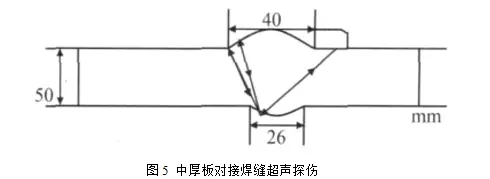 中厚板對(duì)接焊縫超聲波探傷時(shí)探頭下擴(kuò)散聲束在焊縫表面的反射回波很容易被誤判為缺陷。如在厚板焊縫中(T=50mm左右)常發(fā)現(xiàn)距背面4~10mm深度范圍內(nèi)的熔合線附近有不同長度連續(xù)的超標(biāo)反射波(圖5).