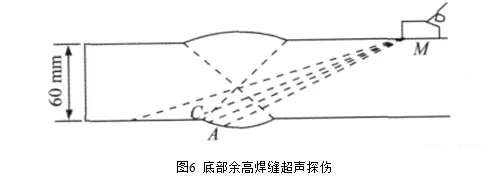 焊縫余高過寬時(shí)會(huì)出現(xiàn)焊縫中部盲區(qū)克服中部盲區(qū)的辦法是增大探頭角度和減小探頭前沿長度(圖4).