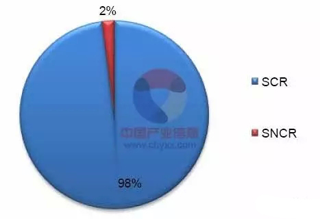 后端煙氣脫硝技術(shù)主要有:選擇性催化還原法(SCR)、選擇性非催化還原法(SNCR)、SNCR-SCR混合法。其中SCR脫硝效率為70-90%SNCR脫硝效率僅為40-60%。在已投運火電脫硝機組中SCR市場份額約98%是絕對的主流技術(shù)。