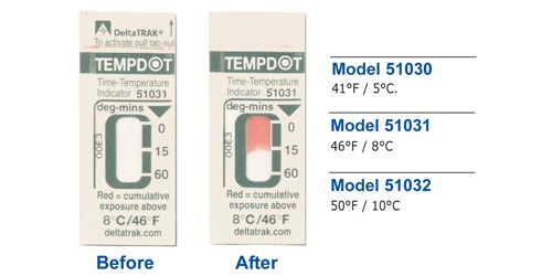 DeltaTrak提供滿足你各種需要的標(biāo)簽:WarmMark溫度標(biāo)簽、高溫?zé)針?biāo)簽和TempDot時間溫度指示標(biāo)簽顯示溫度變 化超過預(yù)設(shè)的時間。FreezeCheck和ColdMark溫度標(biāo)簽用于顯示運(yùn)輸溫度低于0℃。商業(yè)洗碗機(jī)使用的TempDot高溫?zé)針?biāo)簽可顯示最終沖 洗水溫是否達(dá)到71℃(HACCP體系所要求的溫度)。 TempDot時間溫度標(biāo)簽,,型號51030-51032,,是一種低成本的標(biāo)簽,,可顯示溫度高于閾值長達(dá)60分鐘。當(dāng)溫度超過臨界值,,標(biāo)簽顏色變化開始,,但溫度下降到閾值之下時,,標(biāo)簽顏色變化停止,,如此來顯示累積溫度超過的時間-,,對于許多質(zhì)保應(yīng)用來說,度分鐘是非常的重要的概念。有三種溫度閾值5℃、8℃和10℃可供選擇。 這個低成本標(biāo)簽可以指示一段長到60分鐘暴露在臨界點溫度。