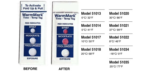 溫度指標標簽是體積小、成本低的溫度指示標簽或時間/溫度標簽,,使用于食品運輸、儲存或處理過程。典型的用途包括監(jiān)測藥品、化學(xué)品和新鮮農(nóng)產(chǎn)品在運輸過程中德溫度。如果溫度超出預(yù)設(shè)的限制之外,,標簽顯示變色。 DeltaTrak提供滿足你各種需要的標簽:WarmMark溫度標簽、高溫?zé)針撕灪蚑empDot時間溫度指示標簽顯示溫度變 化超過預(yù)設(shè)的時間。FreezeCheck和ColdMark溫度標簽用于顯示運輸溫度低于0℃。商業(yè)洗碗機使用的TempDot高溫?zé)針撕灴娠@示最終沖 洗水溫是否達到71℃(HACCP體系所要求的溫度)。 WarmMark 溫度標簽,,型號51013-51035,, 監(jiān)控產(chǎn)品在運輸、 儲存或處理過程中的溫度。反應(yīng)溫度范圍可從-18℃至37℃。這些不干膠標簽直接適用于產(chǎn)品、包裝、紙箱或大包裝上。一旦反應(yīng)溫度達到或超過,,標簽便被激 活而發(fā)生不可逆變色。紅色顯示溫度的閾值外暴露經(jīng)過了一個短暫,,中等或長久的時間段。你一眼便能看出是否有溫度閾值外暴露發(fā)生,,提供質(zhì)量保證的永久記錄。